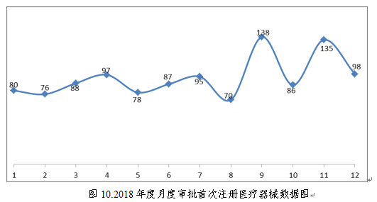 2018年,國(guó)家藥品監(jiān)督管理局共批準(zhǔn)醫(yī)療器械首次注冊(cè)1128項(xiàng),月度審批情況見(jiàn)圖10。
