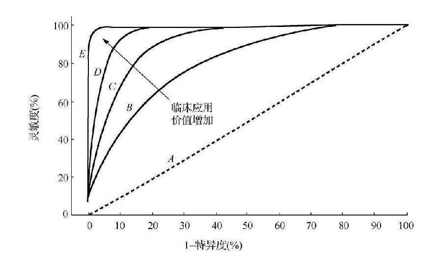 | 一、ROC曲線簡介 1.什么是ROC曲線 ROC曲線即受試者工作特征曲線(receiver operator characteristic curve,ROC),又稱為感受性曲線(sensitivity curve),是反映靈敏度和特異度連續(xù)變量的綜合指標(biāo),通常被用來直觀地確定某一種診斷方法(診斷試劑、診斷設(shè)備)的最優(yōu)診斷界值,即取靈敏度和特異度之和最大的截點,盡量靠近曲線左上方的點。也可以用來對同一種疾病兩種以上的診斷方法的臨床應(yīng)用價值進行粗略的比較評價。 傳統(tǒng)的ROC曲線解決的是“是”或“否”的問題,可以根據(jù)醫(yī)師對讀片結(jié)果類型的不同,分成二分類法和多等級法。考慮到在影像學(xué)中的應(yīng)用,除了判斷是不是病灶,還要考慮病灶所在的位置,以及是單發(fā)病灶還是多發(fā)病灶,需要對病灶進行定性、定位、定量診斷,因此衍生出LROC(location-response operating characteristic)、FROC(free-response operating characteristic)、AFROC(alternative FROC)。 2.ROC曲線的繪制 由于醫(yī)師自身的學(xué)習(xí)背景、工作經(jīng)驗等多方面存在差異,對影像學(xué)設(shè)備成像的讀片也有自己的尺度,即不同的醫(yī)師會有不同的診斷界值。根據(jù)不同的診斷界值對多幅影像做出診斷,并與金標(biāo)準相對照,可分別計算出靈敏度和特異度。根據(jù)診斷界值從低到高取若干個截斷點(至少5組),逐個計算相應(yīng)的靈敏度(真陽性率)、特異度(真陰性率),以靈敏度為縱坐標(biāo),1-特異度(假陽性率)為橫坐標(biāo),標(biāo)出各工作點,然后連接各點繪制而成的曲線。一般情況下,ROC曲線均處于(0,0)和(1,1)連線的上方,選取的工作點越多,曲線越平滑。 3.ROC曲線的應(yīng)用 ROC曲線主要有三方面應(yīng)用。首先,ROC曲線可以直觀地反映診斷方法的靈敏度和特異度;其次,也是最常用的,通過計算ROC曲線下面積(area under roc curve,AUC),對多個器械的臨床應(yīng)用價值進行比較,是一個客觀直觀的指標(biāo)。如下圖的B-E四種影像設(shè)備的ROC曲線,E的AUC最大,臨床應(yīng)用價值最高。ROC曲線下面積的計算通?梢圆捎秒p正態(tài)參數(shù)法和非參數(shù)法進行計算,這兩種方法計算的曲線下面積及其方差十分相近,所以在實際應(yīng)用中不必過分要求數(shù)據(jù)符合正態(tài)分布。最后,是曲線下部分面積,當(dāng)兩個器械的ROC曲線并不像圖中那樣,而是出現(xiàn)交叉時,由于曲線下面積不能反映某一范圍內(nèi)的靈敏度與特異度優(yōu)劣,甚至可能會得出相反的結(jié)論,所以利用曲線下部分面積進行比較,才能反映真實情況。 二、ROC曲線在影像學(xué)設(shè)備中的應(yīng)用 ROC曲線在影像學(xué)設(shè)備中應(yīng)用很多。 第一,可以根據(jù)曲線選擇診斷界值,達到最優(yōu)的靈敏度和特異度,使器械發(fā)揮最佳的效果,也可以通過曲線下面積判斷設(shè)備的成像質(zhì)量,通常0.9及以上的成像效果佳,0.7~0.9成像效果中等,0.5~0.7成像效果較低。這一應(yīng)用多體現(xiàn)在產(chǎn)品生命周期的設(shè)計開發(fā)階段,如深度學(xué)習(xí)輔助決策AI影像學(xué)軟件在設(shè)計開發(fā)過程中通過不同診斷界值的選擇,使軟件達到最優(yōu)的靈敏度特異度組合,發(fā)揮最大臨床應(yīng)用價值。 第二,是通過AUC來評判器械的變更。如某一影像設(shè)備在做影響到臨床應(yīng)用的許可事項變更時,對于臨床應(yīng)用價值變化或成像質(zhì)量的判斷,可以通過變更前和變更后的各自AUC進行比較。若AUC變大,或變化在科學(xué)合理的范圍內(nèi),則可以判定該許可事項變更臨床應(yīng)用相關(guān)部分是合格的。 第三,對不同影像設(shè)備的成像質(zhì)量進行比較。通過計算AUC的大小,來評價兩種或多種同類型影像設(shè)備的臨床應(yīng)用價值的大小或成像質(zhì)量的優(yōu)劣。通過計算曲線下部分面積,也可以判斷在某一靈敏度、特異度范圍內(nèi)不同影像設(shè)備的臨床應(yīng)用價值或成像質(zhì)量。 除以上應(yīng)用外,ROC曲線還可以評價不同診斷醫(yī)師的診斷效能。值得注意的是,在應(yīng)用ROC曲線時,病例的選擇和干擾因素的控制關(guān)系到是否能得到客觀真實的結(jié)論。 |