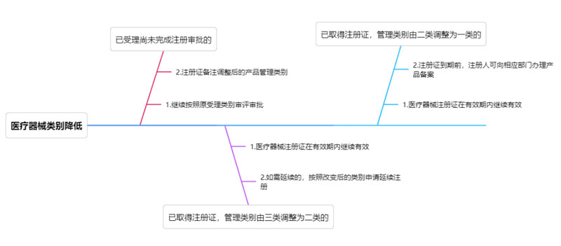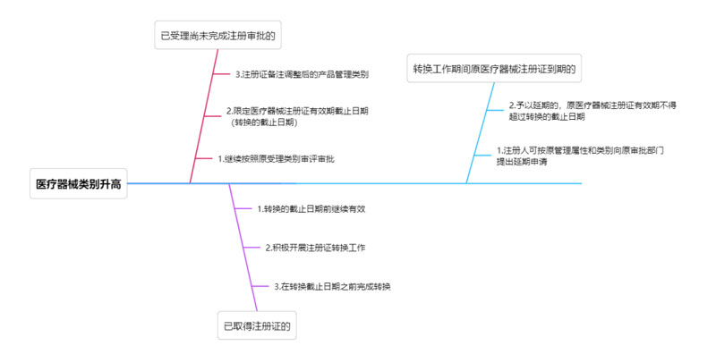 二、管理類型升高 1、已受理醫(yī)療器械 對于公告發(fā)布之日前已受理尚未完成注冊審批(包括首次注冊和延續(xù)注冊)的醫(yī)療器械,藥品監(jiān)督管理部門繼續(xù)按照原受理類別審評審批,準(zhǔn)予注冊的,核發(fā)醫(yī)療器械注冊證,限定醫(yī)療器械注冊證有效期截止日期為過渡期截止日期,并在注冊證備注欄注明調(diào)整后的產(chǎn)品管理類別。 2、已取得二類醫(yī)療器械注冊證